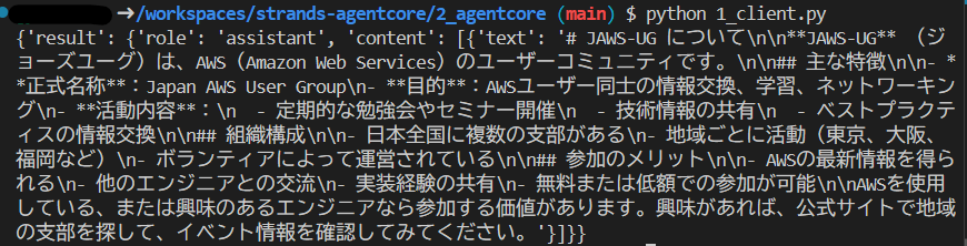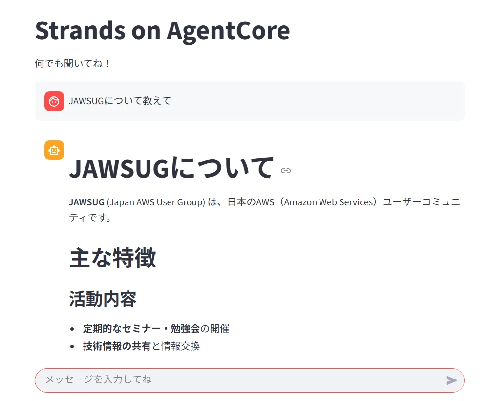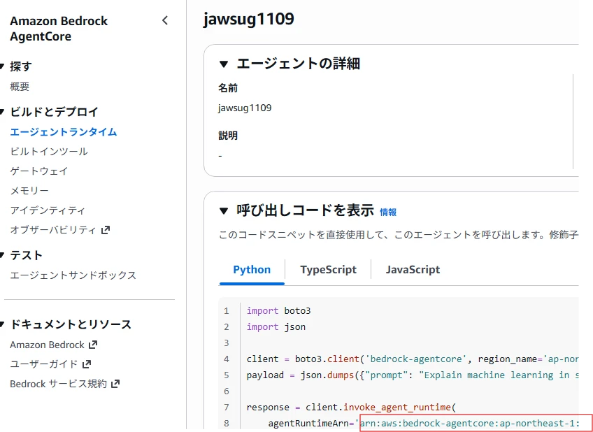 │ Agent ARN: arn:aws:bedrock-agentcore:ap-northeast-1:************:runtime/jawsug1109-S1cIbABGna                                                                  │