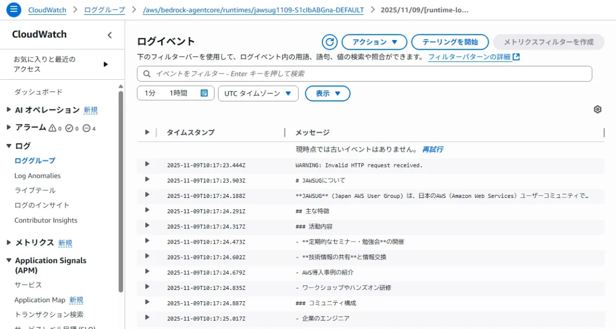 │    /aws/bedrock-agentcore/runtimes/jawsug1109-S1cIbABGna-DEFAULT --log-stream-name-prefix "2025/11/09/[runtime-logs"                                            │